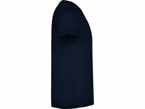 Мужская футболка без боковых швов с коротким рукавом и V-образным вырезом горловины, отделанном рибом 1х1. Горловина и плечевые швы дополнительно укреплены тесьмой.