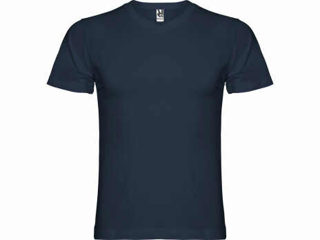 Мужская футболка без боковых швов с коротким рукавом и V-образным вырезом горловины, отделанном рибом 1х1. Горловина и плечевые швы дополнительно укреплены тесьмой.
