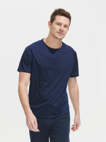 Футболка из спортивной сетки с рукавом реглан. Низ изделия и низ рукавов с двойной отстрочкой.
