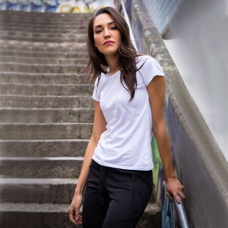 Основная ткань: цвет, близкий к Pantone Black C, ткань отделки (бейка): цвет, близкий к Pantone 651 C Итальянские женские футболки Сalifornia Lady бренда JRC выполнены из 100% чесаного хлопка (англ. сombed cotton) – чрезвычайно мягкого варианта хлопка, изготовленного путем специальной обработки хлопковых волокон. В процессе производства чесаного хлопка удаляются любые загрязнения, пух и самые короткие волокна, а самые здоровые, длинные и тонкие оставляются. После подобной обработки пряжа становится тоньше, ровнее и крепче, что делает футболку Сalifornia более износостойкой. Благодаря отсутствию пуха в процессе носки пряжа не пушится, а само изделие не покрывается катышками. Кроме того, футболка невероятно мягкая, так как в составе пряжи нет коротких волокон, которые могут торчать и колоться, а оставшиеся длинные волокна лежат ближе одно к другому. Так как дизайн и лекала футболки Сalifornia разработаны в Италии, сама модель соответствует всем канонам повседневной моды: * Приталенный крой выгодно подчеркивает достоинства фигуры * Аккуратная горловина обработана изящным рибом 1*1 шириной 0,8 см на манер модных футболок из розничных магазинов * Особая изюминка этой модели – бейка по горловине спинки из ткани Oxford нежно-голубого цвета. Материал, узор которого напоминает тростниковую корзину, появился еще в XIX веке в Шотландии, и с тех пор традиционно используется для пошива мужских сорочек. В данном случае, бейка на футболке является не только неброским аксессуаром этой модели, но и обладает повышенной прочностью, долговечностью и износоустойчивостью, защищая горловину от потертостей и загрязнения. Мы живем с вами в новом удивительном мире, где простая футболка с легкостью заменяет классическую рубашку. Но в знак уважения к этому предмету гардероба, маленький декоративный элемент в виде бейки по горловине спинки на футболке будет напоминать нам о том, что джентльменом или леди можно быть априори, невзирая на устои привилегированных слоев общества викторианской эпохи.