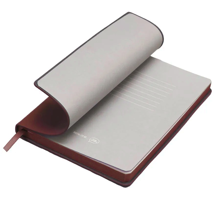 Бизнес-блокнот LADYЦвет обложки бордовый, близкий к Pantone 202 СРазмер 150*210 мм, переплет мягкийОбложка - не термоактивный PU с эффектом кожи наппаБлок в клетку, скругленные углыСрез в цвет обложкиБумага кремовая, плотность 70 г м2Форзац нахцаз серый, близкий к Pantone 5 U Cool grey256 стр, перфорация на последних страницахЛяссе, 7 мм, в цвет обложкиУпаковка сливбокс + бумага