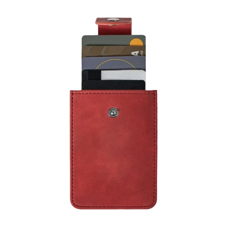 Чехол для карт, цвет красный, PU размер 10.5х7.5 смВнутри выдвижной механизм с отделениями для 4 карт.Хлястик на кнопке.Упаковка - пластиковый пакет