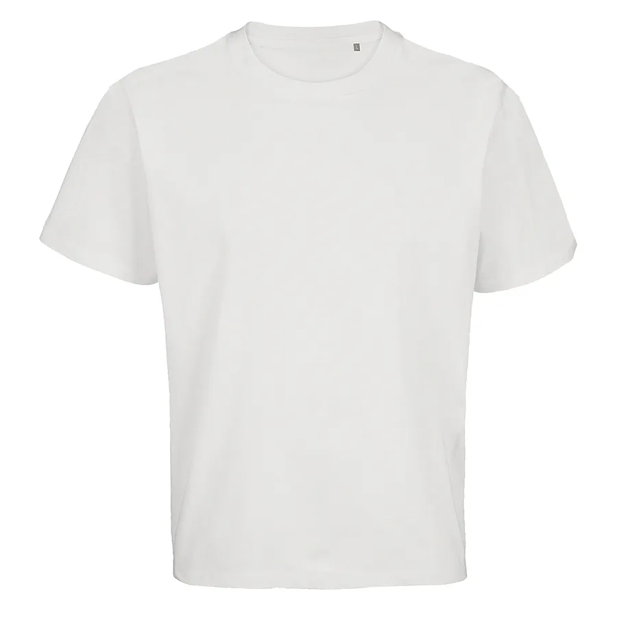 Футболка оверсайз унисекс с круглым вырезом, без боковых швов, высокой плотности. Выполнена из смеси переработанного хлопка (50%) и обычного хлопка (50%).