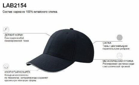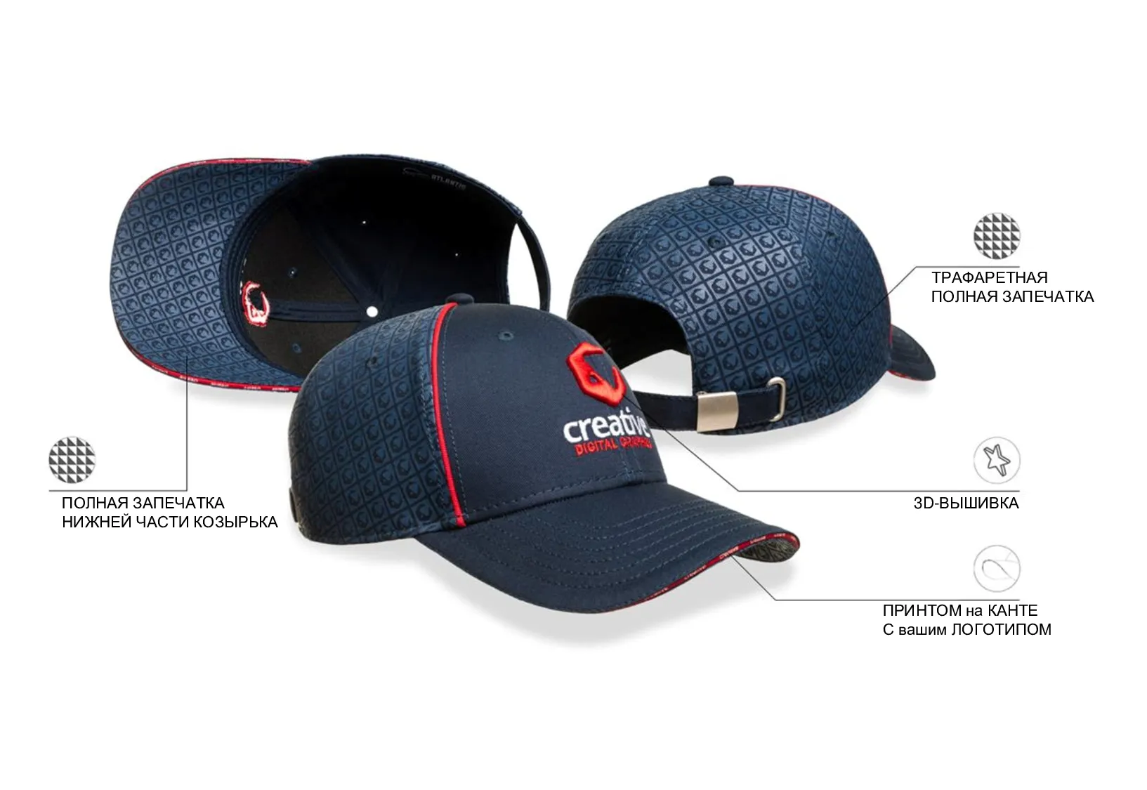 6 клиньев Металлическая застежка 100%хлопок, твил, 280гр м2 3Д-вышивка на переднем клину Трафаретная печать на куполе и на нижней части козырька Принтованый сэндвич Цены: При заказе 576 шт. – 1942р. При заказе 1008 шт. – 1568р.Изготовление и доставка образцов в Москву – 60 дней;Производство и доставка партии в Москву – 180 дней. При авиадоставке срок сокращается до 60 дней, цена изделия увеличивается на 370р.Все логотипы на образце сделаны справочно для вашего ознакомления и будут изменены в соответствие с вашим дизайном в процессе производства.58 см - минимальный размер, с помощью застёжки его можно увеличить до необходимого.