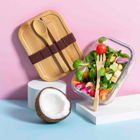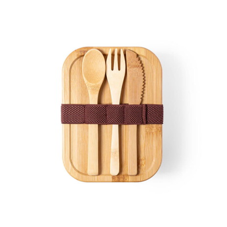 Ланч-бокс с крышкой и столовыми приборами: ложка, вилка, нож. Они крепятся на специальной резинке на корпусе изделия. Крышка сделана из бамбука, оснащена специальной силиконовой лентой по периметру для более плотного прилегания крышки к корпусу и предотвращения протекания. Также крышка может служить небольшим подносом для сервировки. Индивидуальная упаковка - коробка из картона.