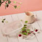Ланч-бокс из боросиликатного стекла с пластиковой крышкой.Благодаря четырем зажимам и силиконовому уплотнителю по всему периметру крышки, она является полностью герметичной.Для 100% герметичности крышки рекомендуется использовать ланч-бокс для жидкости с температурой не более 60 градусов Боросиликатное стекло отличается особой прочностью и жаростойкостью. Впервые боросиликатное стекло появилось в 19м веке и было использовано для сигнальных фонарей. Фонари из обычного стекла быстро лопались из-за перепада температуры, в то время как эти фонари горели и в зимнюю стужу. После этого жена химика, создавшего прочное стекло, попросила попробовать его в духовке для выпечки пирога. Форма из такого стекла выдержала выпекание без нареканий. Вскоре боросиликатное стекло получило всеобщую популярность и стало широко применяться в фармацевтике, детской продукции и, конечно, при изготовлении различной посуды. Индивидуальная упаковка - коробка из белого дизайнерского картона