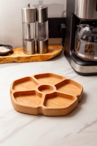 Менажница в форме цветка на 5 ячеек D=23см, выполнен из премиум материала бук. Материал отличается следующими преимуществами: Прочность - премиум материал дерева Бук Безопасность - обладает противомикробными свойствами, не вызывает аллергических реакций Простой в уходе - моется теплой водой, допускается использование средств для мытья посуды Экологичность - натуральное и безопасное сырьеУдобство - устойчив на любых плоских поверхностях, включая диваны и кровати