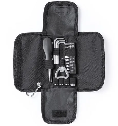 Набор инструментов из 19 аксессуаров в чехле из полиэстера с застежкой-молнией. Включает в себя монтажный инструмент, плоские отверточные головки, крейцкопф и тип torx, набор шестигранных ключей, ключи для шестигранных гаек и открывалку. С металлическим карабином для переноски. Размер: 15 x 9 x 2 см Вес 240 гр.
