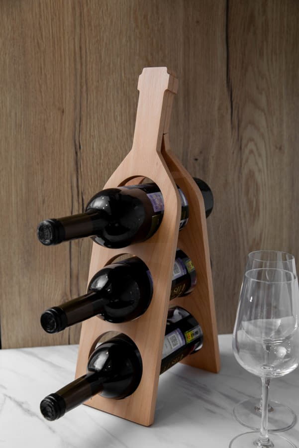 Подставка под винные бутылки, в форме бутылки, предназначен для хранения 3-ёх цилиндрических бутылок, выполнен из премиум материала бук. Материал отличается следующими преимуществами: Прочность - премиум материал дерева Бук Безопасность - обладает противомикробными свойствами, не вызывает аллергических реакций Простой в уходе - моется теплой водой, допускается использование средств для мытья посуды Экологичность - натуральное и безопасное сырьеУдобство - устойчив на любых плоских поверхностях, включая диваны и кровати