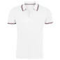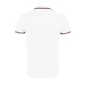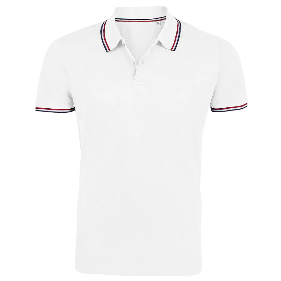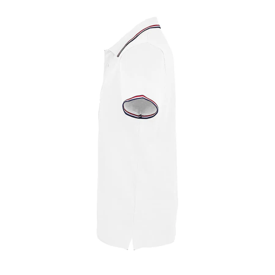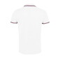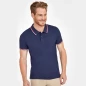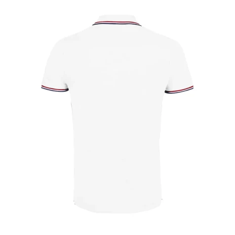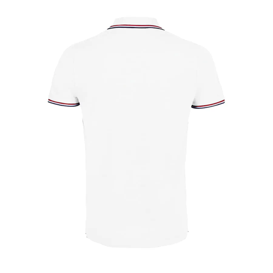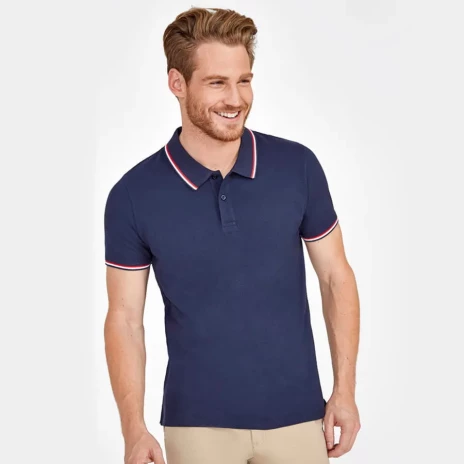 Мужская футболка поло с боковыми швами. Воротник и манжеты вывязаны резинкой 1*1 Контрастные полоски на воротнике, по низу рукавов, внутри бокового разреза и на внутренней стороне воротника. Планка поло на двух пуговицах. Лейбл с размером находится во шве горловины, лейбл производителя вшит в в боковом шве изнутри.