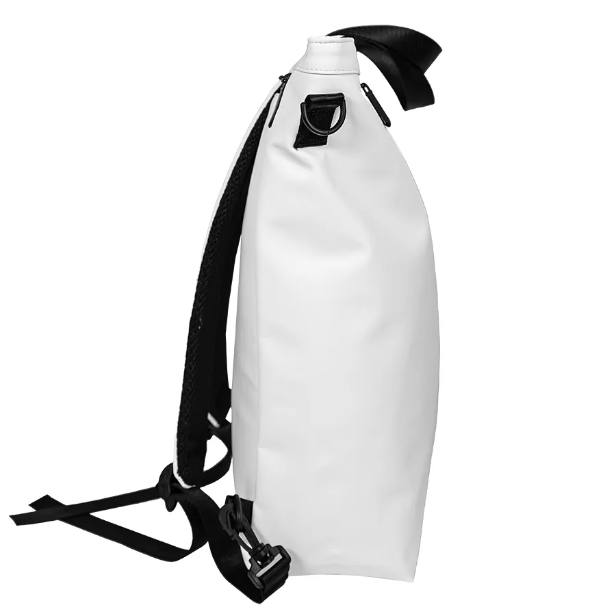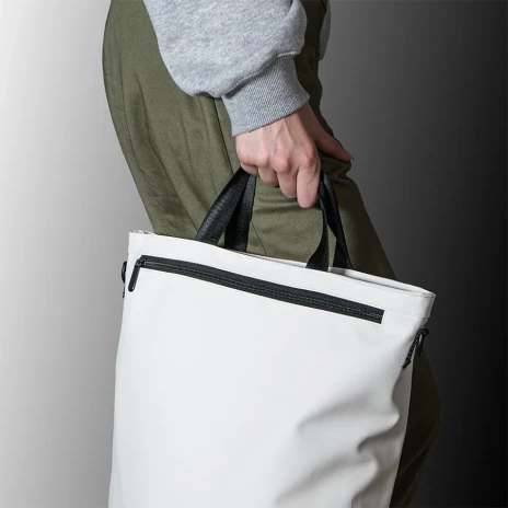 Рюкзак-сумка из 100% полиуретана. Можно использовать как сумку через плечо, можно носить как рюкзак. Лямки можно спрятать в карман. Ручка отстёгивается. Объём 15 литров.