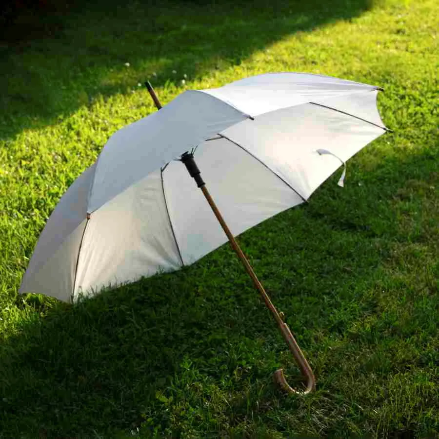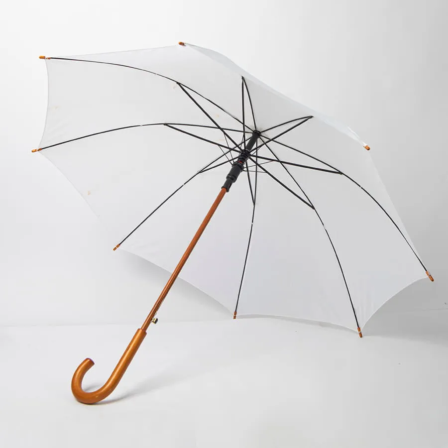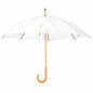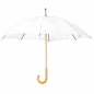 Зонт-трость, механический. Диаметр купола: 105 см., длина стержня 77 см. Состав купола: 100% нейлон 190T. Состав стержня: дерево. Состав спиц: металл. Ручка: дерево. Цвет купола: белый.