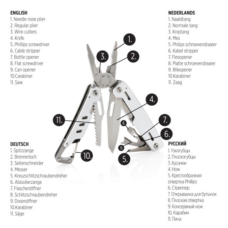 Надежный и долговечный мультитул с 11 функциями. Корпус выполнен из алюминия, а инструменты — из нержавеющей стали. В мультитуле предусмотрены: узкогубцы, плоскогубцы, кусачки, нож, крестообразная отвертка Phillips, стриппер, открывалка для бутылок, плоская отвертка, консервный нож, пила и карабин для крепления. Поставляется в фирменной коробке.