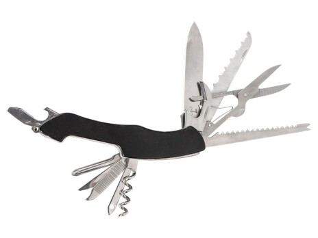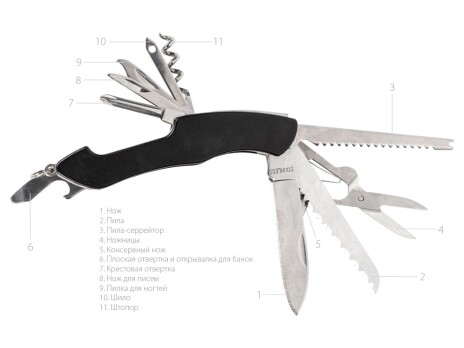 Cскладной нож-мультитул 11-в-1 «Demi» выполнен из нержавеющей стали. Поставляется в нейлоновом чехле. 1. Нож 2. Пила 3. Пила-серрейтор 4. Ножницы 5. Консервный нож 6. Плоская отвертка и открывалка для банок 7. Крестовая отвертка 8. Нож для писем 9. Пилка для ногтей 10. Шило 11. Штопор