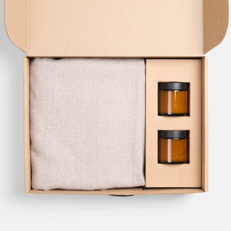 Мягкий плед с нежной бахромой станет идеальным спутником для расслабляющих вечеров и придаст стильный облик любому интерьеру. Две ароматические свечи в элегантных стеклянных баночках мягко наполнят пространство расслабляющим светом и тонким ароматом, добавляя нотки спокойствия и гармонии.