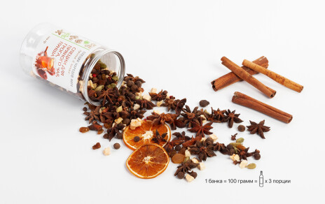 - специи для глинтвейна, пряного чая, пунша, грога 100 гр (3 порции: палочки корицы, бадьян, гвоздика, кардамон, изюм, яблоки сушеные, перец душистый, апельсины сушеные кольцами, перец розовый); h 11 х d 7 см;