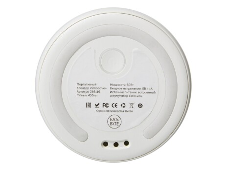 Портативный блендер «Smoothie» от Eat&Bite — идеальное решение для приготовления смузи, протеиновых коктейлей и других напитков в любом удобном месте! Работает без подключения к сети, заряжается от беспроводной зарядной станции, что позволяет взять его с собой в авто, путешествие, на работу или на пикник. Напиток / блюдо будут всегда свежими и с лёгкостью приготовлены за считанные секунды. • Объем 450мл • Ножи из нержавеющей стали марки 304 • Время зарядки 2.5 часа • Беспроводная станция зарядки в комплекте • Мощность 50 Вт • Ёмкость аккумулятора 1400 мАч • Обороты: 22 000 в минуту