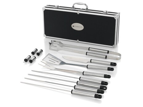 - Комплектность - 4 шампура, 4 шпажки для снятия шашлыка, нож, щипцы, вилка и лопатка