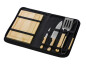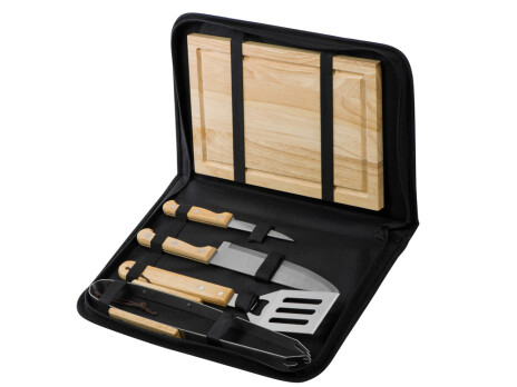 - Комплектность - разделочная доска 20 х 30 см, щипцы 34,5 см, лопатка 32,5 см, нож для стейка 21,5 см, нож большой 31,5 см, чехол из полиэстера 38,5 х 4,5 х 24,8 см