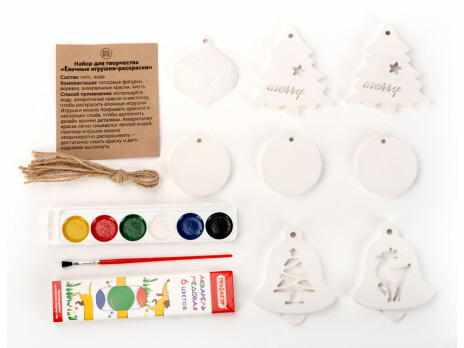 Создание уникальных новогодних игрушек своими руками — популярная и всеми любимая предновогодняя традиция, а также отличная возможность провести время с ребенком, не только весело, но и с пользой, а также стимулировать творческий потенциал юного творца. Мы подготовили готовый творческий набор, состоящий из игрушек, выполненных их гипса, кисти и акварельных красок. Способ применения: используйте воду, акварельные краски и кисточку, чтобы раскрасить ёлочные игрушки. Игрушки можно покрывать краской в несколько слоёв, чтобы дополнить дизайн яркими деталями. Акварельная краска легко смывается теплой водой, поэтому игрушки можно неоднократно раскрашивать — достаточно смыть краску и дать изделиям высохнуть.