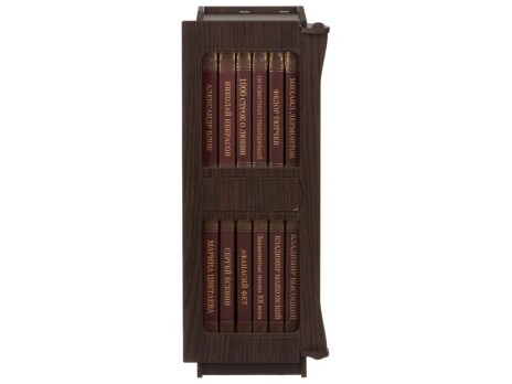 От этого изделия мы не смогли отказаться. Это настоящий книжный шкаф, только в миниатюре (высотой всего 38,6 см), а в нем книги – одна лучше другой. Каждая из них может стать настольной. В книгах собраны изящные высказывания и мудрые мысли лучших умов человечества. Вы только вглядитесь в перечень книг, и сразу же станет ясно, что лучшего подарка не найти. Коллекция книг (в комплект входит 12 книг): - Облако в штанах. Владимир Маяковский - Знаменитые песни XX века. Сергей Есенин, Белла Ахмадулина, Михаил Танич - Стихи о России. Александр Блок, Николай Рубцов, Сергей Есенин - Не жалею, не зову, не плачу... Сергей Есенин - Однообразные мелькают... Николай Гумилев - Ночь, улица, фонарь, аптека. Александр Блок - Свеча горела на столе. Борис Пастернак - Мне нравится, что Вы больны не мной. Марина Цветаева - Я вернулся в мой город... Осип Мандельштам - Песня последней встречи. Анна Ахматова - 1000 строк о любви. Александр Блок, Андрей Белый, Марина Цветаева, Сергей Есенин, Николай Гумилев, Анна Ахматова, Осип Мандельштам, Федор Тютчев, Афанасий Фет - Серебряный век. Александр Блок, Анна Ахматова, Владимир Маяковский В конструкции шкафа предусмотрен съемный шильд, на котором можно сделать персонализацию.