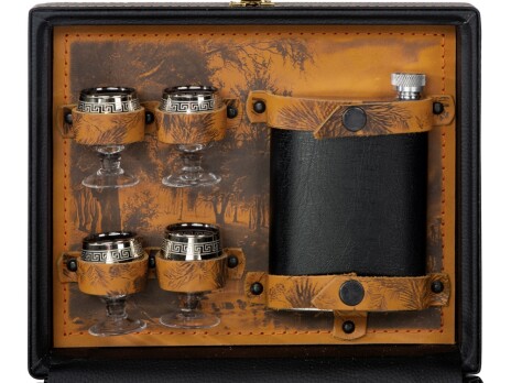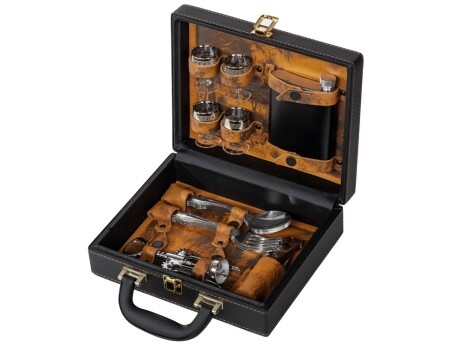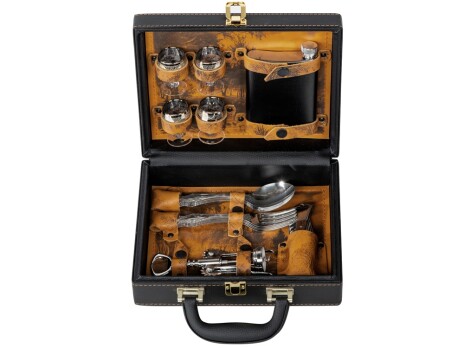 Кейс из сплит-кожи, с повышенной износостойкостью, внутренняя отделка натуральная кожа. Рисунок нанесен путем термообработки. В комплект входит: - дипломат - стопка 30 мл - 4шт - фляга 250 мл - вилка - 4 шт - ложка - 4 шт - штопор - нож складной