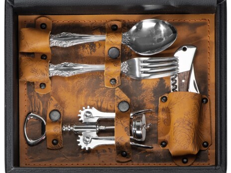 - Материал товара - дипломат- сплит-кожа/натуральная кожа, стопки- хрусталь, фляга, ложки, вилки, штопор- нержавеющая сталь, нож- нержавеющая сталь/дерево