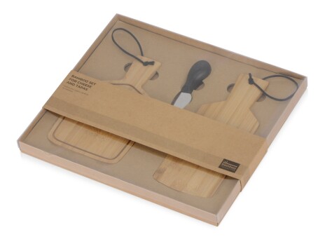 Набор для сыра и тапасов состоит из двух небольших досок и ножа для сыра. Доски изготовлены из натурального бамбука. Они имеют разную форму, что особенно удобно для подачи разных видов закусок, и оснащены веревочками, с помощью которых их можно повесить на стену. В набор входят: - две бамбуковые доски, - листовидный нож для твердых сортов сыра.
