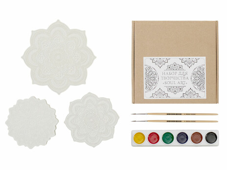 Набор для творчества «Soul Art» станет прекрасным подарком для тех, кто хочет отвлечься от рутины и переключить свое внимание на творчество. . В набор входят три гипсовых фигурки мандал, а также акварельные краски и 2 кисти - более тонкая для прокраски самых тонкие деталей и чуть более толстая. Мандалы можно покрывать краской в несколько слоев, чтобы дополнить дизайн яркими деталями. После раскрашивания их можно использовать как костеры или элемент декора дома или офиса. • Интересное занятие для детей и взрослых • Можно использовать как декоративный элемент или костер.