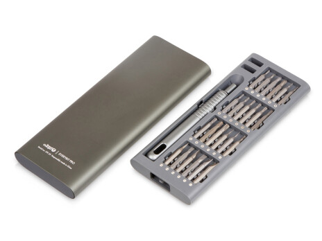 Набор прецизионных отверток Everybit Pro из 48 предметов изготовлен из промышленной стали марки S2. Подходит для ремонта смартфонов, айфонов, макбуков, айпадов, электроники, часов, фотоаппаратов, ноутбуков, очков, печатных плат, игрушек, ПК, игровых консолей и многого другого. Механизм открытия футляра — push-to-open, что означает следующее: для того, чтобы внутренняя часть футляра выдвинулась, необходимо аккуратно нажать на грань, находящуюся в углублении — после этого лоток с инструментами выдвинется сам. Обратите внимание на то, что для исправной работы механизма необходимо правильно размещать внутренний лоток при каждом использовании, в противном случае работа механизма будет нарушена, и для вынимания лотка понадобится встряхнуть футляр. Преимущество такого футляра — в его защите от внезапного открытия и повреждений содержимого. • Большое количество насадок • Магнитайзер для бит • Металлический кейс с защитным механизмом