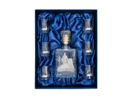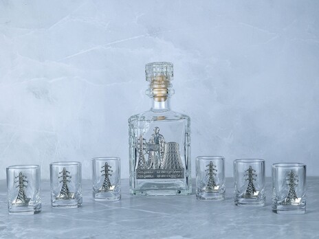 Подарочный набор со штофом «Энергетики». Традиционная для русского человека комплектация: элегантный графин емкостью 700 мл. с оловянным барельефом «ЭНЕРГЕТИК» и 6 стопок емкостью 50 мл. с оловянным барельефом «Опора ЛЭП». Материал барельефов: сплав с содержанием олова не менее 95%(пьютер). Художественное литье,чернение с эффектом антикварного серебра,полировка. Ручная работа. Подарочная упаковка «люкс» с атласным ложементом.