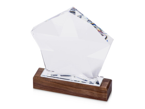 Награда выполнена из прозрачного стекла в виде звезды и расположена на деревянном постаменте. Благодаря выпуклым сторонам она интересно переливается в лучах света. Пятиконечная звезда является символом охраны и безопасности и известна более трёх тысяч лет. • Форма звезды • Прозрачное стекло • Деревянная подставка