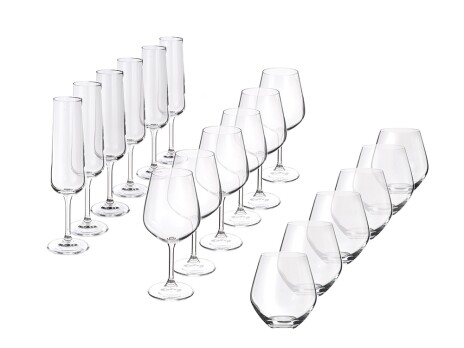 - Комплектность - бокал 550 мл d10 х 11,2 см- 6 шт, бокал для вина 460 мл d9 х 20 см- 6 шт, бокал для игристого 205 мл d6,5 х 23 см- 6 шт
