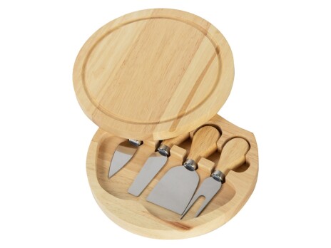 Подарочный набор для сыра в деревянной упаковке включает в себя три вида ножей и одну вилку. С помощью приборов можно нарезать сыры разных сортов. Набор упакован в деревянную подарочную коробку, которую можно использовать для хранения этих инструментов. Удобный поворотный механизм позволяет использовать крышку в качестве разделочной доски. Специальные выемки в коробке фиксируют приборы в безопасном положении. Набор включает в себя: - листовидный нож для твердых сортов сыра, - нож-лопатка для мягких сортов сыра, - вилка для сыра, - нож для твердых сортов сыра, - разделочная доска с поворотным механизмом.