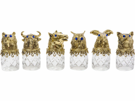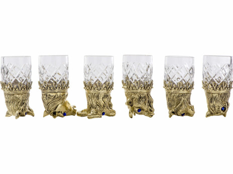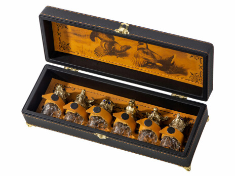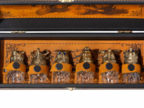 Футляр из эко-кожи, внутренняя отделка натуральная кожа рыжего цвета. Рисунок нанесен путем термообработки. В набор входит шесть стопок по 30 мл. Хрусталь, литьё.