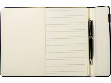 Эксклюзивный блокнот формата A5 с обложкой из термополиуретана, черной лентой-закладкой, застежкой на магните и 80 линованными листами (80 г/м²) кремового цвета. Предлагается с шариковой ручкой.