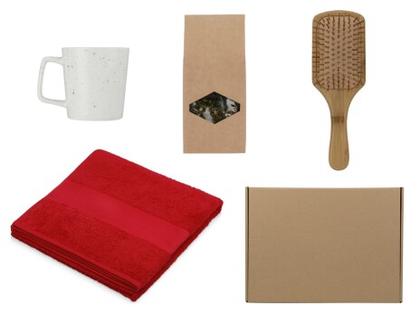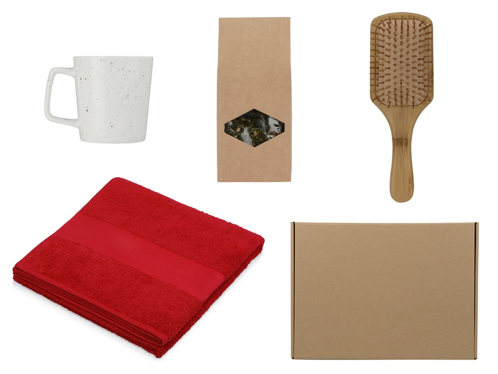 - Материал товара - полотенце - 100% хлопок, расческа - бамбук, чай - картонная упаковка, кружка - костяной фарфор, коробка - картон