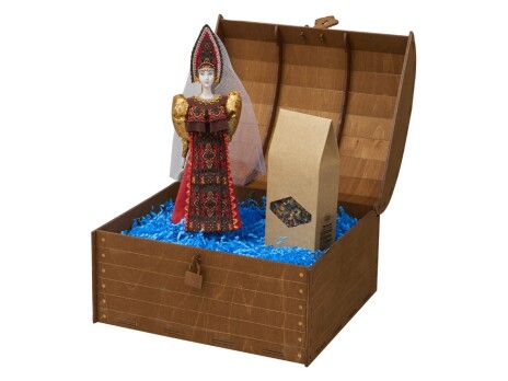 Подарочный набор с фарфоровой куклой и ароматным чаем. Гармония русских традиций, уюта и изысканного вкуса воплотилась в этом изысканном подарке. Набор станет прекрасным презентом для близких, деловых партнеров или иностранных гостей, желающих прикоснуться к русской культуре. Комплектация: - Фарфоровая кукла в народном костюме ручной работы: алый сарафан с пышными рукавами и расшитый кокошник создают образ русской красавицы в праздничном наряде. - Фруктовый чай "Малина с мятой" (70 г) с нежным ягодным вкусом и освежающим мятным послевкусием. Идеальное дополнение для душевных посиделок. - Стильное оформление: синяя декоративная стружка подчеркивает благородство подарка и надежно фиксирует его содержимое. Особенности упаковки: Деревянный сундучок с замочком превращает набор в драгоценный ларец. Возможность нанесения именной таблички добавляет презенту индивидуальности, делая его по-настоящему памятным подарком.