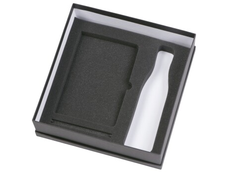 - Материал: блокнот - искусственная кожа с покрытием soft-touch, ручка - алюминий с покрытием soft-touch, термобутылка - нержавеющая cталь с покрытием soft-touch, коробка - картон