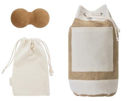 - Материал: массажный мяч - пробковый материал, неокрашенный хлопок, рюкзак - 250 г/м2 натуральный джут, 140 г/м2 натуральный хлопок, карман -180 г/м2 натуральный хлопок