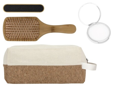- Материал: расческа, пилка для ногтей - бамбук, бальзам для губ -пластик, несессер - хлопок, пробка, ручка - полиэстер