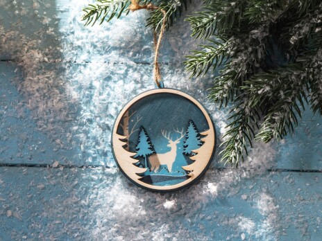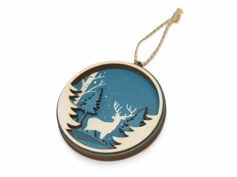 Игрушка выполнена из трех слоев фанеры и прекрасно подходит для того, чтобы украсить новогодний набор, подарок либо стать самостоятельным небольшим памятным презентом. Игрушка имеет свой рельеф: приглядитесь, и вы заметите, что фигуры пейзажа находятся на разных слоях фанеры, что придает изображению объемность.