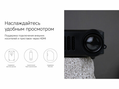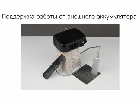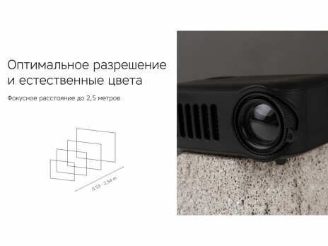 Основные характеристики: Тип устройства: мультимедиа LCD проектор Рекомендуемая область применения: для дома и офиса Разрешение матрицы: 320 × 240 пикселей (LCD) Ресурс LED-лампы: 30000 часов Световой поток: 800 люмен Контрастность: 1000:1 Проекционное расстояние: 0,53 – 2,54 м Размер проекции: 0,39 – 1,86 м Соотношение сторон: 16:9, 4:3 ИК-датчик: задняя панель Динамики: 2 Вт Комплектация: проектор, пульт ДУ, тренога, кабель HDMI, крышка объектива, руководство пользователя, адаптер питания Интерфейсы: Входы: HDMI, USB Type-A 2.0, microSD, DC-in Выходы: аудиовыход 3,5 мм Источники данных: microSD, USB Type-A Питание: DC 12 В / 2 А (от адаптера) или 5 В / 2 А micro-USB Медиапроигрыватель: Максимальное разрешение видеофайлов: 1080p Видеоформаты: AVI, MKV, MPG, WMV, TS, MP4, MOV, FLV, VOB, 3GP Видеокодеки: H.265, H.264, H.263, MPEG-4, MPEG 1/2, DivX, Xvid, AVC, AVCHD Аудиоформаты: MP3, AAC, WAV, FLAC, WMA, OGG Изображения: JPG, BMP, PNG Список поддерживаемых форматов и кодеков неполный.
