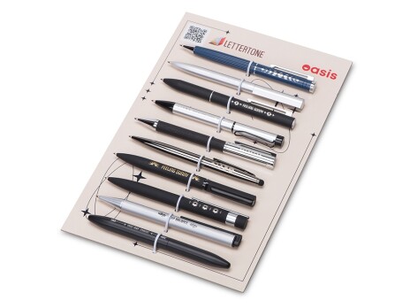 Сет металлических ручек Lettertone — это готовый презентационный комплект, включающий 10 стильных моделей ручек с примерами нанесения: гравировка и тампопечать. В сете представлены самые хитовые позиции категории ручек бренда Lettertone, а также новинки каталога периода зима-весна 2025 года. Все образцы надежно закреплены на стильной картонной подложке резиновым фиксатором. А на обратной стороне указаны названия моделей с кратким описанием. Промо-набор — идеальный инструмент для презентаций: клиенты могут подержать ручки в руках, опробовать их в деле и наглядно увидеть различия между видами нанесения. При этом все самые важные модели собраны в одном легком и компактном наборе.