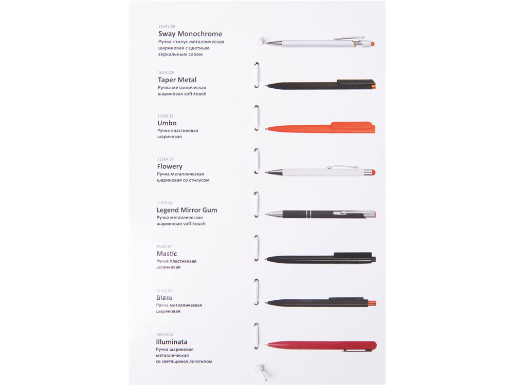 Промо-сет ручек с интересными нанесениями — это презентационный комплект, включающий 8 уникальных моделей с несколькими вариантами нанесения: гравировка и заливка полимерной смолой. В сете представлены самые хитовые позиции категории, а также новинки каталога периода зима-весна 2026 года. Все образцы аккуратно закреплены на стильной картонной подложке при помощи резинового фиксатора. На обратной стороне указаны названия и краткое описание моделей. Промо-набор — идеальный инструмент для презентаций: клиенты могут подержать ручки в руках, опробовать их на письме и наглядно увидеть различия между видами нанесения. При этом все самые важные модели собраны в одном легком и компактном наборе.