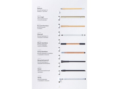 Промо-сет вечных карандашей — это презентационный комплект, включающий 9 уникальных моделей с несколькими вариантами нанесения: УФ-печать, тампопечать, гравировка и круговая гравировка. В сете представлены самые хитовые позиции категории вечных карандашей, а также новинки каталога периода зима-весна 2025 года. Все образцы аккуратно закреплены на стильной картонной подложке при помощи резинового фиксатора. На обратной стороне указаны названия и краткое описание моделей. Промо-набор — идеальный инструмент для презентаций: клиенты могут подержать карандаши в руках, опробовать их на письме и наглядно увидеть различия между видами нанесения. При этом все самые важные модели собраны в одном легком и компактном наборе.