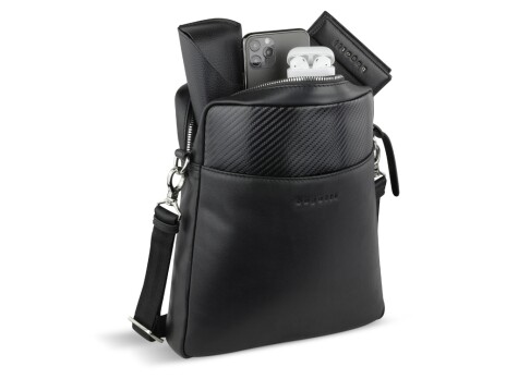 НАПЛЕЧНАЯ СУМКА COMET Уникальная комбинация материалов делает коллекцию мужских сумок COMET оригинальной и неповторимой. Гармоничное сочетание воловьей кожи и карбоновой отделки неизменно привлекает к себе внимание окружающих. Для создания карбоновой отделки кожи используется сложная, тщательно разработанная технология, которая придает продукции необычный 3D-эффект и исключительную прочность. Коллекция COMET – идеальное сочетание функциональной организации, элегантности и современного стиля. СВОЙСТВА Функциональная организация: основное отделение на молнии с 2 карманами на молнии и 2 открытыми карманами, передний карман, задний карман на молнии, съемный регулируемый плечевой ремень (до 140 см). Материал: воловья кожа/полиэстер Размер: 23,5 х 5 х 26 см Вес: 0,34 кг