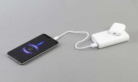 Гаджет объединяет в себе 2 устройства - пауэрбанк с увеличенной мощностью/скоростью зарядки через кабели и беспроводную быструю зарядную станцию для смартфона/смарт-часов Apple Watch/наушников.