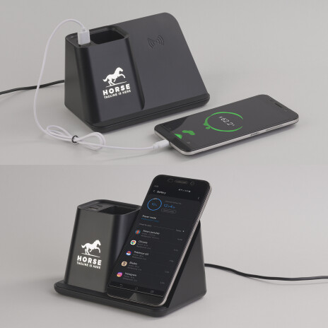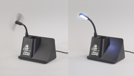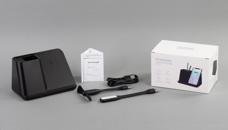 Многофункциональный гаджет с возможностью яркой персонализации – эффектной подсветкой логотипа. Кабель длиной 150 см. позволит подключить и разместить карандашницу в любом удобном месте Вашего рабочего стола. Комплект из персональных вентилятора и лампы дополнен актуальной, повышенной мощности (10W) функцией беспроводной зарядки. А для зарядки смартфона стандартным проводным способом можно использовать разъёмы USB или Type-C, находящиеся в карандашнице.
