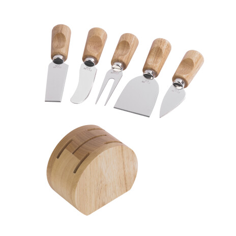 Подставка и рукоятки выполнены из каучукового дерева, имеют характерный текстурный рисунок. Данная порода дерева обладает высокой прочностью и устойчива к влаге. Лезвия - из пищевой нержавеющей стали.